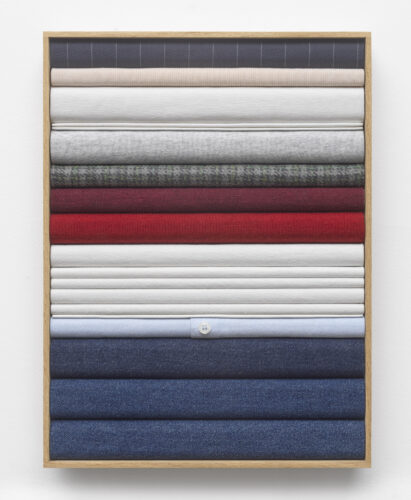 Ein lohnendes Ziel stellt zum Beispiel der Stand der Galerie Dürst Britt & Mayhew aus Den Haag dar. Auch diese für spannende Newcomer:innen-Positionen bekannte Galerie hat sich in diesem Jahr erneut für eine Solo-Präsentation entschieden. Am Stand präsentiert werden drei Serien der 1989 geborenen neuseeländischen Künstlerin Maja Klaassens. Auf großes Interesse stießen Klaassens’ Arbeiten aus der Serie „Washing“. Die unterschiedlichsten eigenen und gefundenen Textilien bringt die Künstlerin mit großer Präzision auf Träger aus Pinienholz auf und ordnet diese zu abwechslungsreichen, horizontal geschichteten Streifenbildern an, die nicht von Ungefähr an Wäschestapel im Kleiderschrank erinnern. Die wie ein Bild an der Wand hängenden Objektkästen aus Eichenholz sind für 3.200 Euro im Angebot. Aspekte von eher chaotischer Häuslichkeit beleuchtet die Künstlerin dann in ihrer Werkgruppe „Nightstand“. Hier konzentriert sie sich auf private Objekte, wie sie typischerweise auf Nachtschränkchen zu finden sind. Klaassens formt die intimen Ensembles, die sie in den Wohnungen von Freund:innen entdeckt, aus Kunstharz, Holz und Acrylfarbe nach. Beide Serien persiflieren auf humorvolle Weise häusliche Routinen und Spleens.