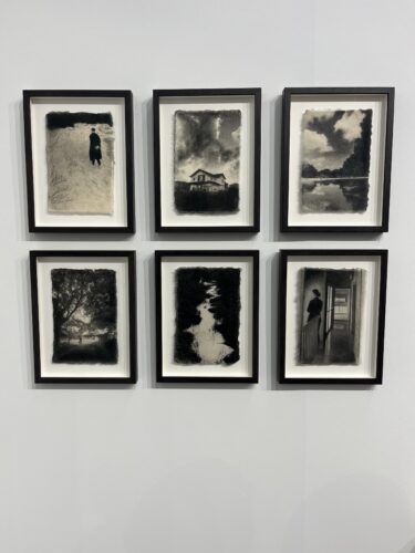 Auf den ersten Blick wie Zeichnungen in Tusche oder Graphit wirken die kleinformatigen Arbeiten des in Frankreich lebenden Japaners Naohiro Ninomiya bei der Antwerpener Galerie Ibasho. Ninomiya überträgt Schwarz-Weiß-Fotografien in klassischer Silbergelatinetechnik auf handgeschöpftes japanisches Washi-Papier. Seine Aufnahmen von isolierten Frauenfiguren in Rückenansicht oder einsam gelegenen Holzhäusern aus der Werkgruppe „Ephemeral Moment“ (2025) vermitteln einen Eindruck von Stille und Melancholie, wie man ihn eher von Vertretern des skandinavischen Symbolismus wie Vilhelm Hammershøi oder Edvard Munch kennt (Auflage: 8, je 1.200 Euro inkl. Mwst.)