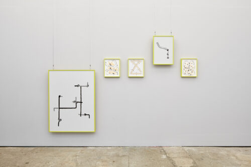 SA: Ich verwende oft diese gelbe Signalfarbe. Ich mag den Bruch der knalligen Farbe mit den sehr erdigen Tönen der Keramiken oder auch den haut- und lederfarbigen Zeichnungen, die ebenfalls in dieser Rahmenfarbe stecken. Mir gefiel die Idee, die Fotomontagen und die Zeichnungen wie Schilder im öffentlichen Raum anzusehen, so als ob sie ein Symbol zur Orientierung, ein Wegweiser oder ein Kommunikationshinweis sein könnten.