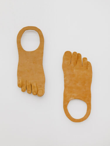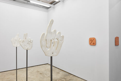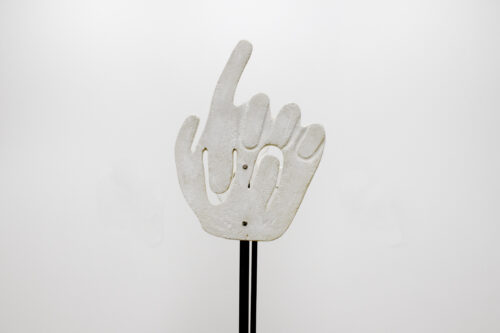 SA: Die Arbeit heißt 3 und 2 und 1. Zunächst wollte ich vor allem Schilder machen, die im Raum stehen – in diesem Fall flachere Keramiken, die zu beiden Seiten Handgesten zeigen. Die angedeuteten Gesten stehen in den verschiedenen Ikonographien und Kulturen beispielsweise für Runter- bzw. Aufzählung, für Orientierungsweiser, für Mahnung, Schwurbruch oder auch für Bitte um Schutz.