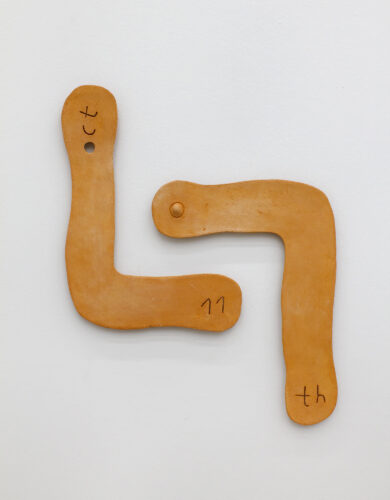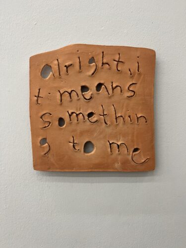 NB & HK: In der Hamburger Ausstellung und auch in deinem Künstlerinnenbuch „Alright, it means something to me“, das du dort und zuvor schon bei anderen Gelegenheiten in Graz und Berlin öffentlich vorgestellt hast, sind ja etliche Arbeiten aus Ton zu sehen. Und zwar in Form von relativ flachen Tafeln mit Einritzungen. Damit bewegst du dich in einer jahrtausendealten Tradition. Die Sumerer, Babylonier und Assyrer haben ab dem Ende des 4. Jahrtausends vor Christus schriftliche und bildliche Darstellungen in Ton gefertigt. Was fasziniert dich an diesem Material? Es ist ja einerseits recht duldsam und beliebig formbar, andererseits aber vielleicht auch etwas widerständig und bockig…