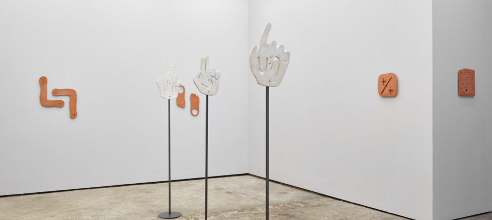 SA: Die Arbeit heißt 3 und 2 und 1. Zunächst wollte ich vor allem Schilder machen, die im Raum stehen – in diesem Fall flachere Keramiken, die zu beiden Seiten Handgesten zeigen. Die angedeuteten Gesten stehen in den verschiedenen Ikonographien und Kulturen beispielsweise für Runter- bzw. Aufzählung, für Orientierungsweiser, für Mahnung, Schwurbruch oder auch für Bitte um Schutz.