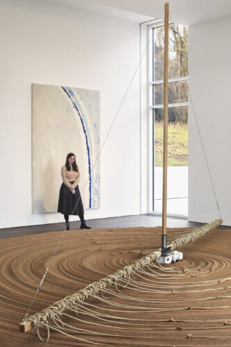 Die Ausstellung im Arp Museum Bahnhof Rolandseck zeigt aber auch eher selten präsentierte Werkaspekte. Ende der 1960er Jahre beginnt Günther Uecker, seinen Materialkosmos zu erweitern. Jetzt werden auch Materialien wie Sand, Erde, Holz und Textilien zu physischen Trägern seiner künstlerischen Ideen. In Remagen zu sehen ist etwa die raumfüllende Arbeit „Sandmühle“, ursprünglich aus dem Jahre 1969. In der Mitte eines aus relativ grobem Sand geformten Kreises mit einem Durchmesser von sieben Metern befindet sich ein elektrischer Antrieb, der an langen Holzstangen befestigte dünne Seile mit kleinen Knoten an den Enden, mit gleichbleibendem Tempo langsam durch den Sand pflügen lässt. Die Arbeit strahlt eine große meditative Ruhe aus und gemahnt das Publikum an Vorstellungen von Gelassenheit, kosmischer Ordnung und universeller Spiritualität.