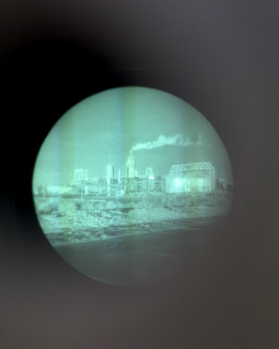 Programmatischer Ausgangspunkt der Aufnahmen von Lisa Barnard ist der Saltonsee, der durch einen Dammbruch im Jahre 1905 entstandene größte Binnensee Kaliforniens. Das heute hochgradig mit giftigen Chemikalien und Düngemittelrückständen verseuchte Gewässer diente der US-Army im Zweiten Weltkrieg als Testareal für die Erprobung der Treffgenauigkeit des Atombombentyps, mit dem Hiroshima und Nagasaki zerstört wurden. Zudem wird hier heute Lithiumkarbonat abgebaut, genau der Rohstoff, der die zunehmend KI-gesteuerten Systeme unserer modernen Lebenswelt am Laufen hält. Barnards zwischen Schönheit und Dystopie changierende Aufnahmen zeigen wüstenartig-zerklüftete Landschaften, die Algenblüte im rotgefärbten Wasser des Sees, Schlammlöcher, Industrieanlagen, aber auch die immer noch sichtbaren Zielplattformen der US-Army aus den Jahren 1944 und 1945. Lisa Barnard flankiert ihre eigenen Aufnahmen mit einer Reihe von Archivbildern, etwa Aufnahmen, die Bombenschützen des B-29-Bombers „Enola Gay“ mit dem Norden-Zielgerät zeigen, einem Vorläufer heutiger zielsuchender Raketen und Marschflugkörper. Angesichts der täglich auf uns einflutenden Medienbilder des Kriegsgeschehens in Israel, im Iran, im Libanon und den Golfstaaten ist das von höchster Aktualität.