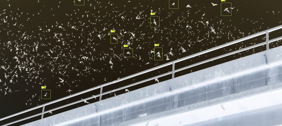 So zum Beispiel zum Yolo Causeway, einem auf Hunderten von Betonpfeilern aufgeständerten Highway vor den Toren der kalifornischen Stadt Sacramento, der über ein sumpfartiges Überschwemmungsgebiet führt. Eine Viertelmillion Fledermäuse lebt unterhalb dieser rund fünf Kilometer langen Brücke. Barnard hat sie besucht und zusammen mit Fledermausschützer:innen von der Organisation Los Angeles Bat Rescue ihre Flugbahnen kartiert. Aus dem gewonnenen Material sind mehrere künstlerische Arbeiten entstanden, darunter eine in ständiger Bewegung befindliche „Fledermauswolke“, die mit der Hilfe lernender Algorithmen erstellt wurde. Zu sehen sind ihre Arbeiten jetzt in der Ausstellung „You Only Look Once“ im Rahmen des „After Nature. Ulrike Crespo Photography Prize 25“ im Crespo Open Space in Frankfurt. Die Beschäftigung mit der Wahrnehmung und dem Verhalten von Fledermäusen repräsentiert allerdings nur einen kleinen Teilaspekt ihrer Arbeit. Doch dazu später mehr.